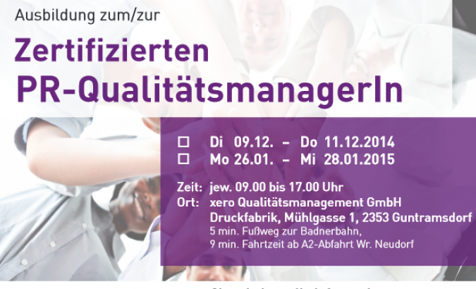 Im Dezember 2014 startet der erste Lehrgang zum „Zertifizierten PR-Qualitätsmanager“, zur „Zertifizierten PR-Qualitätsmanagerin“. Nach dem im März 2014 präsentierten „Österreichischen PR-Gütezeichen“ und dem im Mai vorgestellten „Zertifizierten PR-Einzelberater“ ist dies die dritte Säule der Qualitätsoffensive von PRVA und ÖPR